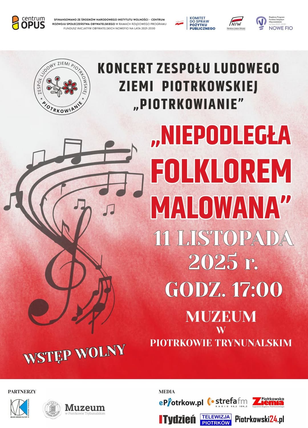 Z okazji Narodowego Święta Niepodległości zapraszamy na wyjątkowy spektakl muzyczny „Niepodległa Folklorem Malowana” w wykonaniu Zespół Ludowy Ziemi Piotrkowskiej Piotrkowianie — poruszającą opowieść o miłości do Ojczyzny, wolności i odwadze naszych przodków.